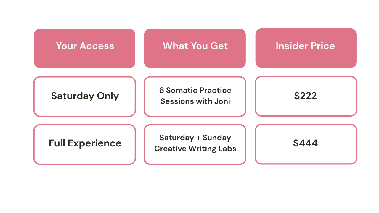 Imagine journaling your truth, reading it aloud, then hearing how it lands in a native earāall in one sacred hour. | | | What Happens When You Join | | | - Saturday ā breathe, move, and untangle the nervous system with Joni.